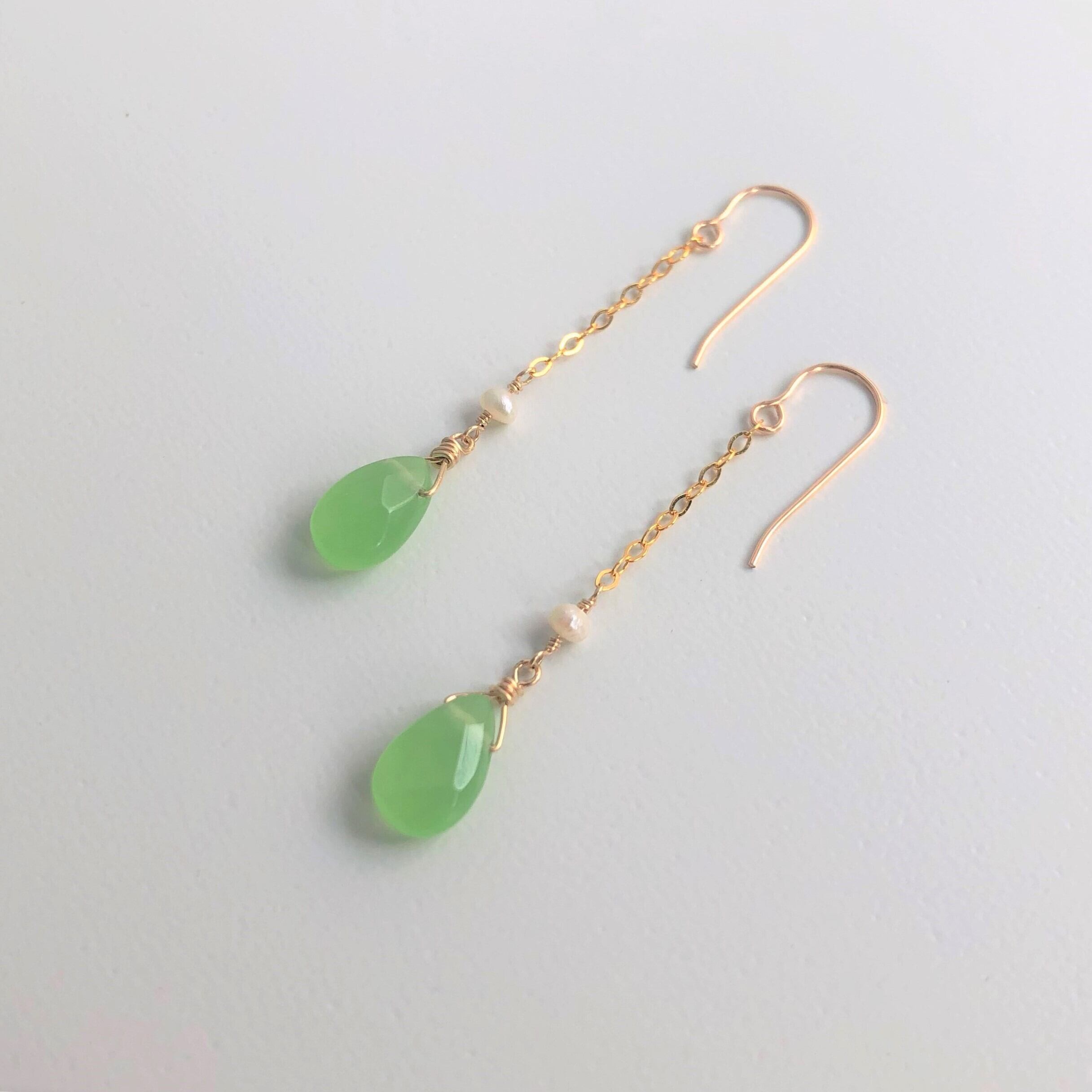 ドロップカットのペリドットと淡水パールにチェーンをプラスしたロングピアスです。