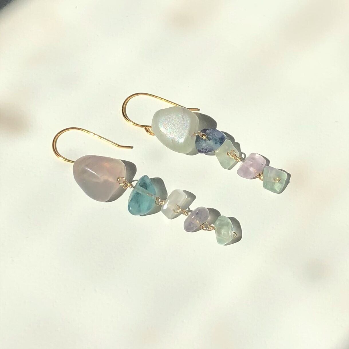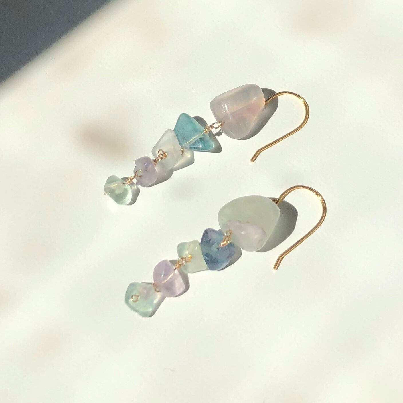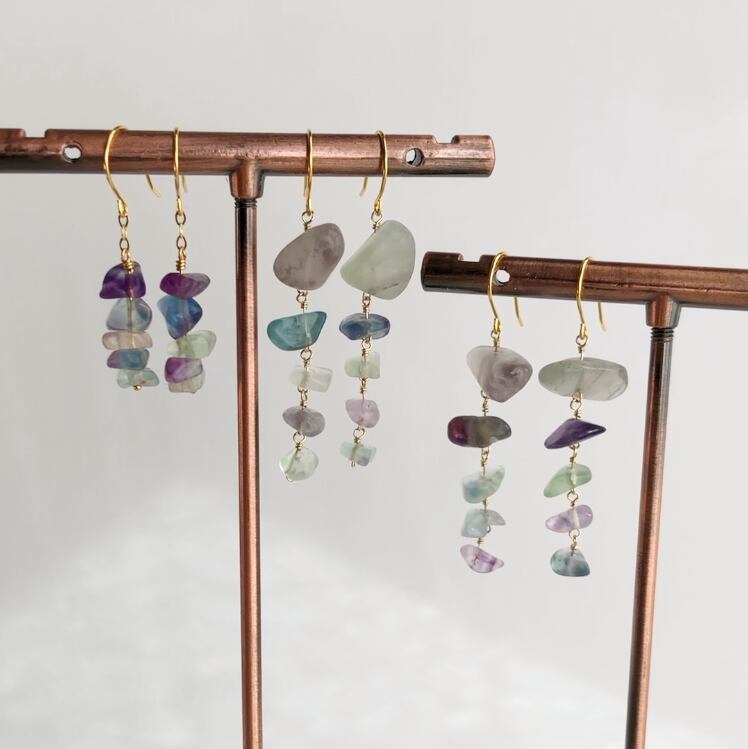 ラフカットのレインボーフローライトを5粒、サイズグラデーションになるようにつなげたフックピアスです。